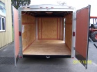 Homesteader enclosed trailer. 6'2" interior height, 3/4" plywood floor, 3/8" plywood walls, barn doors, 32" side door, roof vent, sidewall vents, stone guard, lockable doors and drop axle with 15" Radial tires. L.E.D. lights. CALL FOR PRICING!
