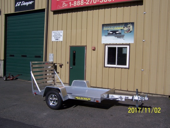 | | Aluma Mfg. 54"x8', extruded aluminum deck, 4' gate, stake pockets, torsion axle, 13" radials with alum. wheels, L.E.D. lights and swivel jack. Bi-fold gate.(24" Sideboard Kit + $) CALL FOR PRICING!!