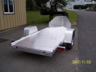 Aluma trailers. Single bike trailer. 51"x138" Extruded aluminum floor, aluminum salt shield with rock guard, wheel chock, 4 HD tie downs, full width slide under ramp, torsion axle, 13" radials with aluminum wheels, swivel jack and L.E.D. lights