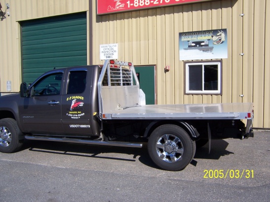 Aluma Flat Deck. Extruded aluminum floor, stake pockets and rub rails, L.E.D Lighting, rear valance and mud flaps. Made in the U.S.A. for single wheel and dually replacements. CALL FOR PRICING!