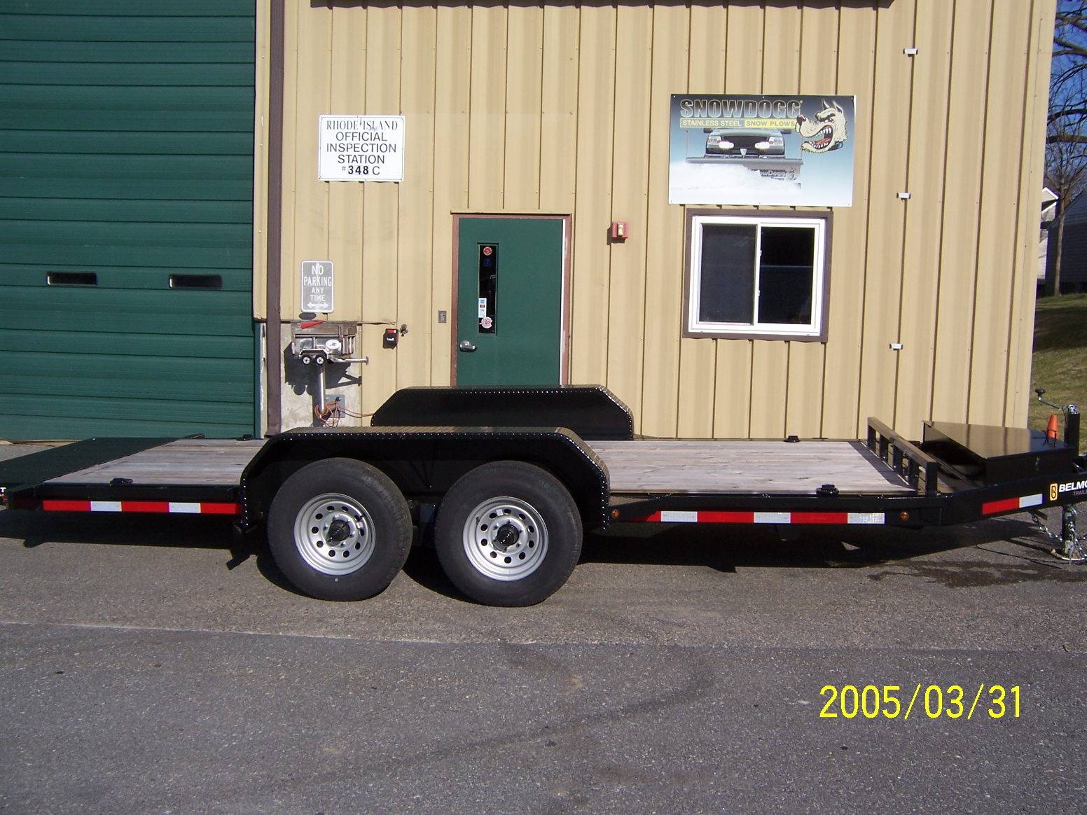 | | Belmont Mfg. 9,950 g.v.w. tilt deck,knife edge, L.E.D. lighting, self adjusting brakes, 2"x8" P.T. decking, adj. coupler, lock out valve, locking tool box, stake pocket and D Ring tie downs.